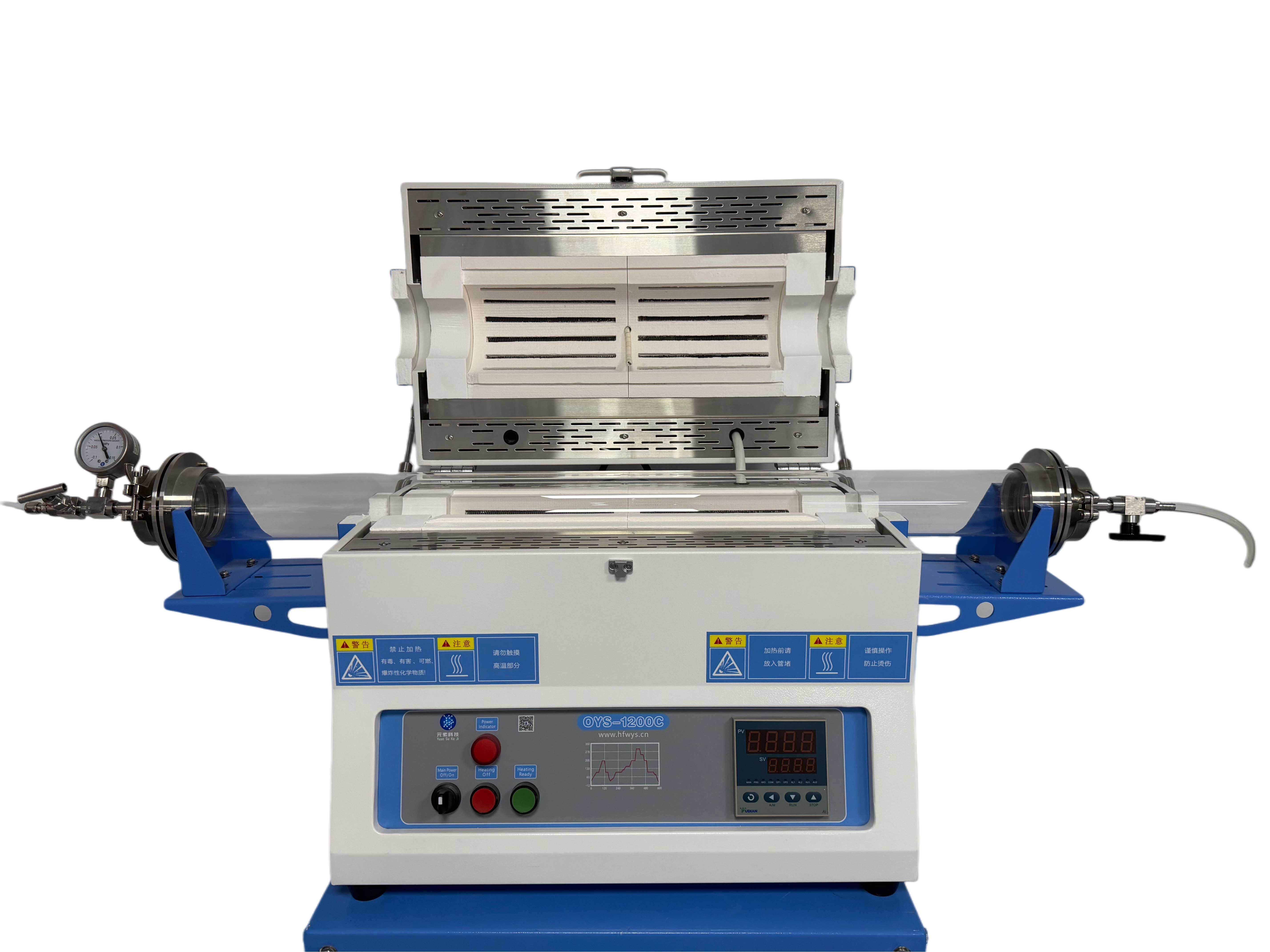 產品概述:一款開啟式管式爐,其最高溫度可以達到1200℃(1200℃<0.5h)。采用雙層殼體結構,并帶有風冷系統;爐膛采用氧化鋁纖維材料,最大程度的減少能量損失;內爐膛表面涂有高溫氧化鋁涂層,可以提高反射率及設備的加熱效率,同時也可以延長儀器的使用壽命,每個溫區分別有獨立的溫控系統控制。